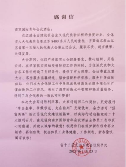 江蘇省第十三屆人民代表大會第五次會議于2022年1月20日至1月23日在南京召開。河西集團青奧城公司國際青年會議酒店和金陵江濱酒店作為本次大會的重點接待單位,圓滿完成了此次接待任務(wù),獲得與會代表的一致好評。