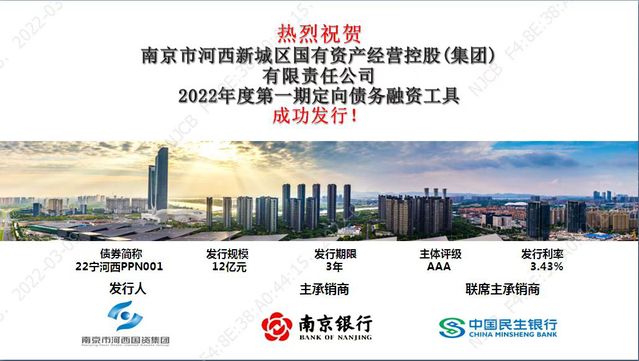 3月9日,南京市河西新城區(qū)國有資產(chǎn)經(jīng)營控股(集團)有限責(zé)任公司(以下簡稱“河西集團”)成功發(fā)行2022年度第一期定向債務(wù)融資工具。