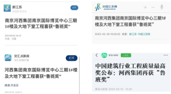 編者按:企業(yè)高質(zhì)量發(fā)展,離不開高品質(zhì)的產(chǎn)品。2022—2023年度第一批中國建設(shè)工程魯班獎名單近日公布,由河西集團投資,集團新城公司代建的南京國際博覽中心三期1#樓及大地下室工程榜上有名。對此,交匯點新聞、中國江蘇網(wǎng)、紫金山新聞等省市多家主要媒體進行了專題報道。