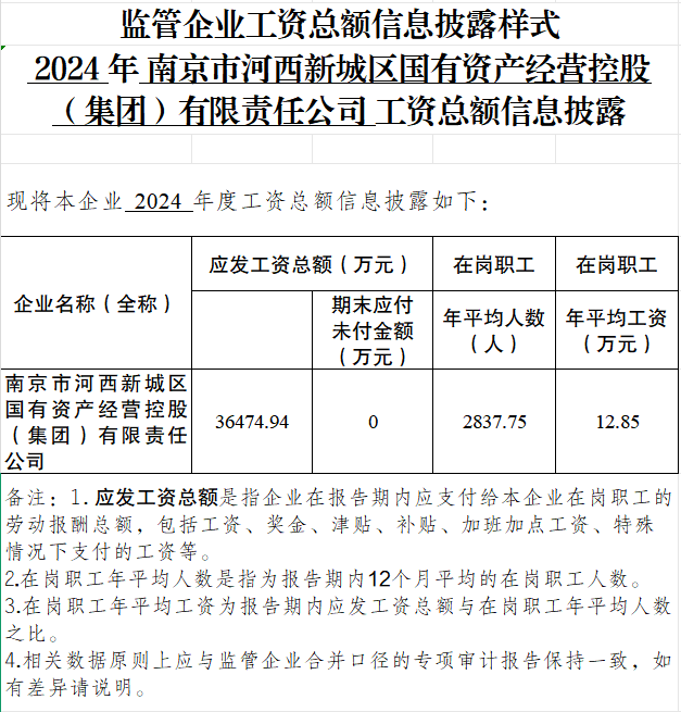 2024年南京市河西新城區(qū)國(guó)有資產(chǎn)經(jīng)營(yíng)控股(集團(tuán))有限責(zé)任公司工資總額信息披露